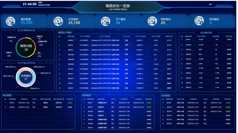 通過可視化看板實時監控模具的領用狀態、維進度和保養情況口并關聯追蹤對應生產機臺及產品的信息。
