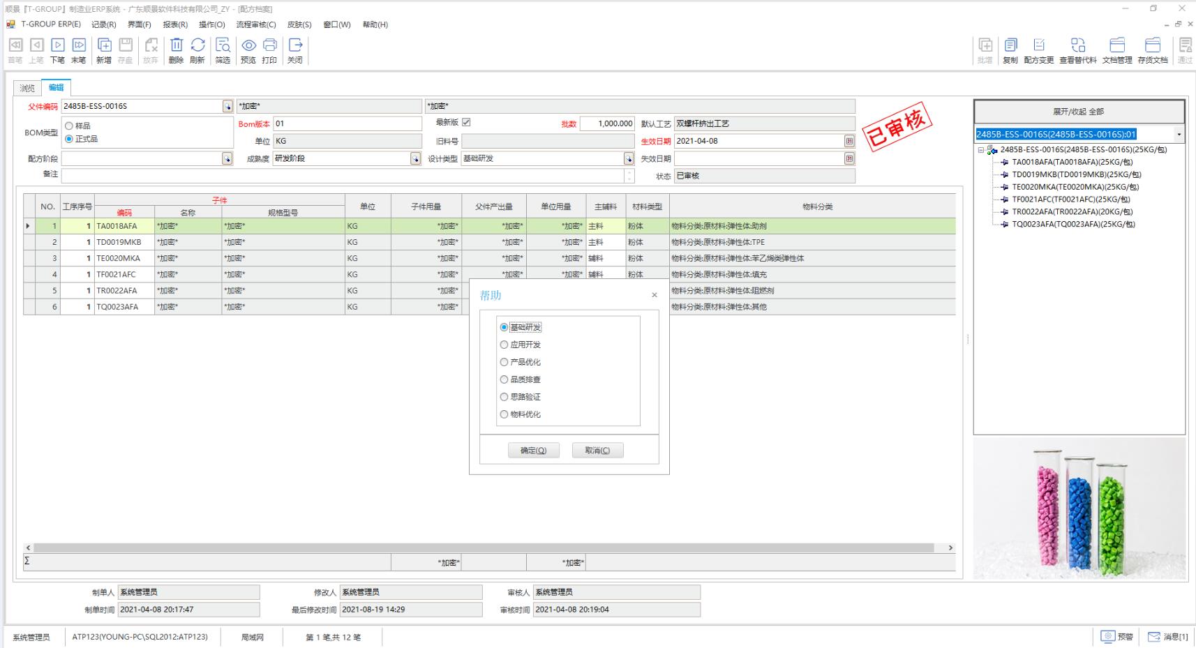 順景S9 ERP對于改性塑料工廠的配方研發(fā)過程進(jìn)行了全程管理,從發(fā)起配方,到參與實(shí)驗(yàn)的配方,配方輪次、優(yōu)選配方、終審配方,以及制樣工藝、試片工藝、測試套餐,都進(jìn)行了記錄和管理,這為研發(fā)部門提供了詳盡的研發(fā)履歷查詢,并累積形成研發(fā)配方庫、生產(chǎn)工藝庫。