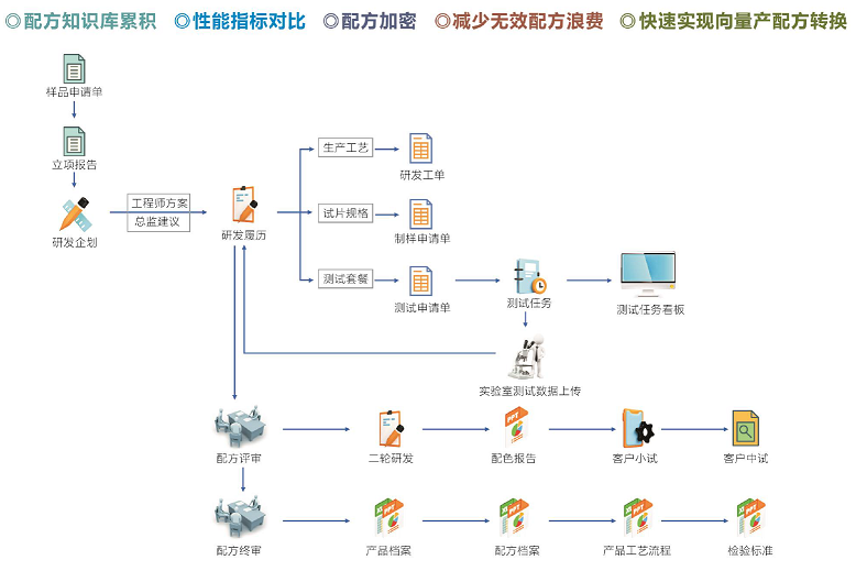 每個工程師只能看到參與的配方,防止數據外泄,配方從方案設計到下達任務,制樣小組按工單進行生產樣品,記錄樣品生產工藝、配色過程。